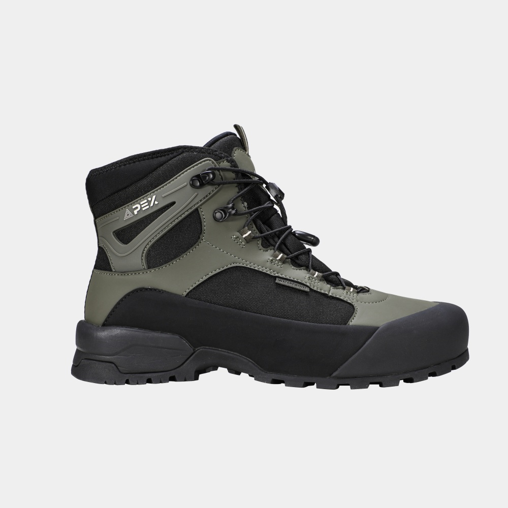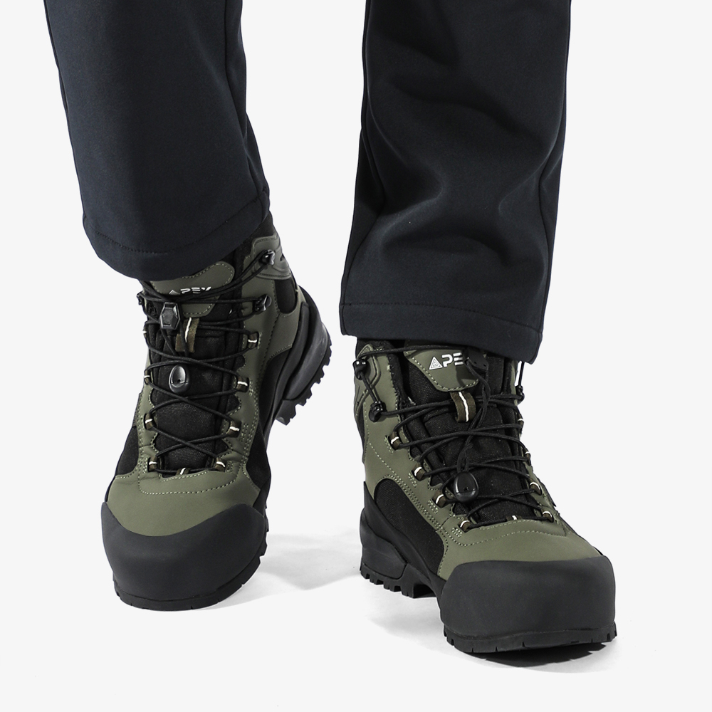 Верхняя часть ботинка изготовлена из комбинации высококачественной эко-кожи, обеспечивающей прочность и защиту, и износостойкой ткани, способствующей воздухопроницаемости. Внутренняя отделка выполнена с использованием мембраны APEX-TEX – передовой технологии, которая гарантирует превосходную водонепроницаемость и паропроницаемость, поддерживая оптимальный микроклимат внутри ботинка. Подошва представляет собой двухслойную конструкцию: промежуточный слой из легкого и амортизирующего материала EVA снижает ударную нагрузку, а внешний слой из прочной резины с развитым протектором обеспечивает надежное сцепление с различными типами поверхностей, предотвращая скольжение.