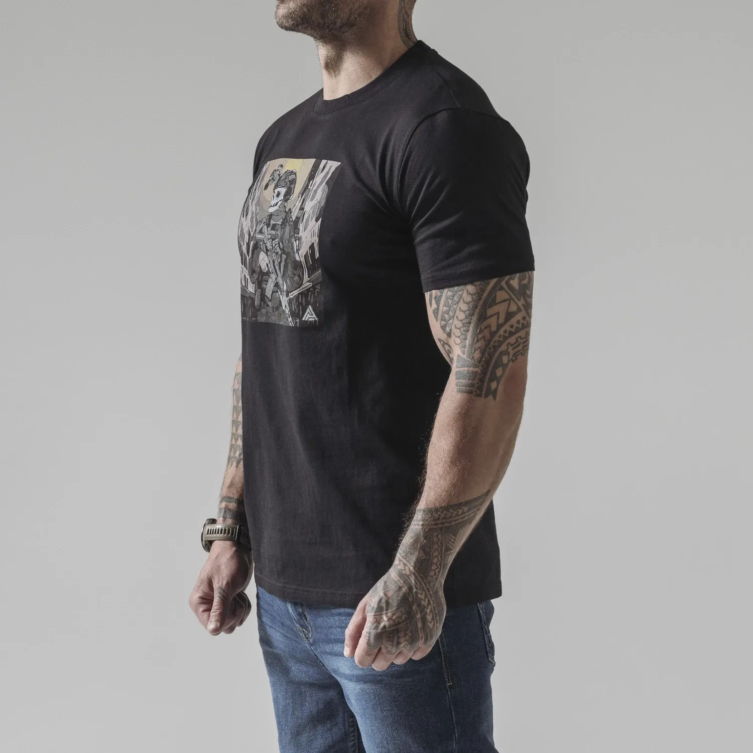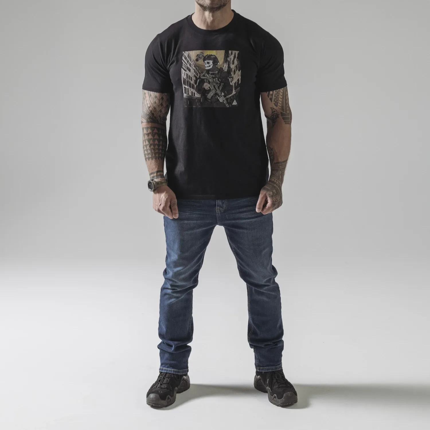Футболка DA Skeleton воплощает смелый уличный стиль с тактическим уклоном. Готовый к бою скелет на фоне разрушенного города создает постапокалиптическую атмосферу с мрачной эстетикой - идеально подходит для стрельбища, тренировок или повседневных операций.
