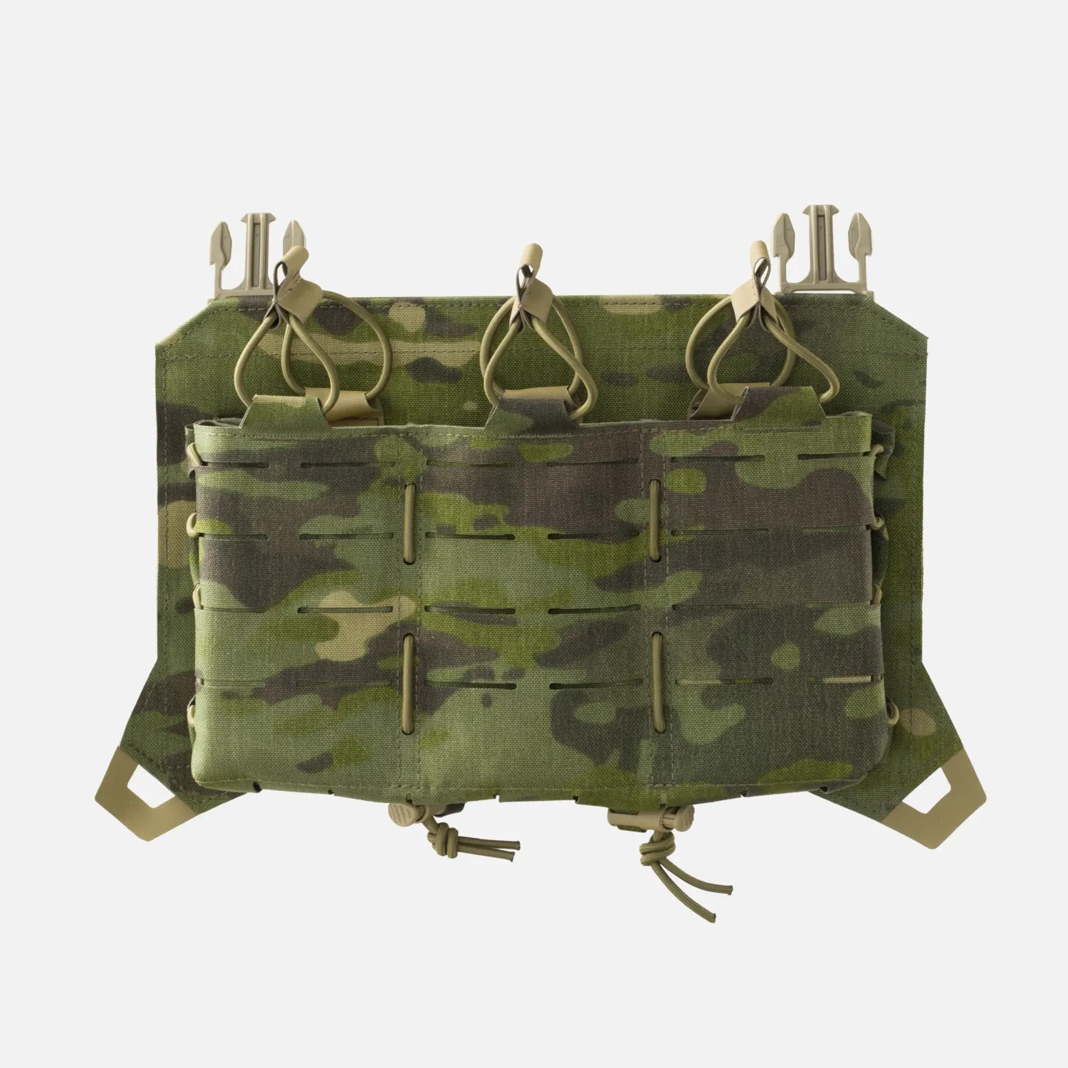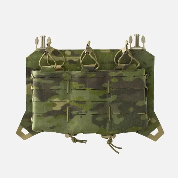 ТРОЙНОЙ КЛАПАН МАГАЗИНА ВИНТОВКИ имеет одна из дополнительных заслонок, доступных для системы SPITFIRE®.ых для системы SPITFIRE®. Регулируемый тройной подсумок для винтовки, пришитый непосредственно к клапану, позволяет носить три магазина для винтовок AR, AK или SR на платформе. Магазины также крепятся сверху с помощью эластичных шнуров с противоскользящими фиксаторами Hypalon®. Клапан почти полностью изготовлен из фирменного ламината, который не только гарантирует долговечность, но и немного жестче, чем стандартная Cordura®, что позволяет легко убирать магазины в кобуру. Передняя поверхность откидной створки покрыта системой лазерной резки, совместимой с MOLLE/PALS, что обеспечивает дополнительную модульность. Откидная створка совместима с пластиночными креплениями SPITFIRE®, SPITFIRE® MK II и HELLCAT®. Клапан может быть прикреплен к держателю пластины через специальные отверстия в клапане или с помощью прилагаемых пряжек.