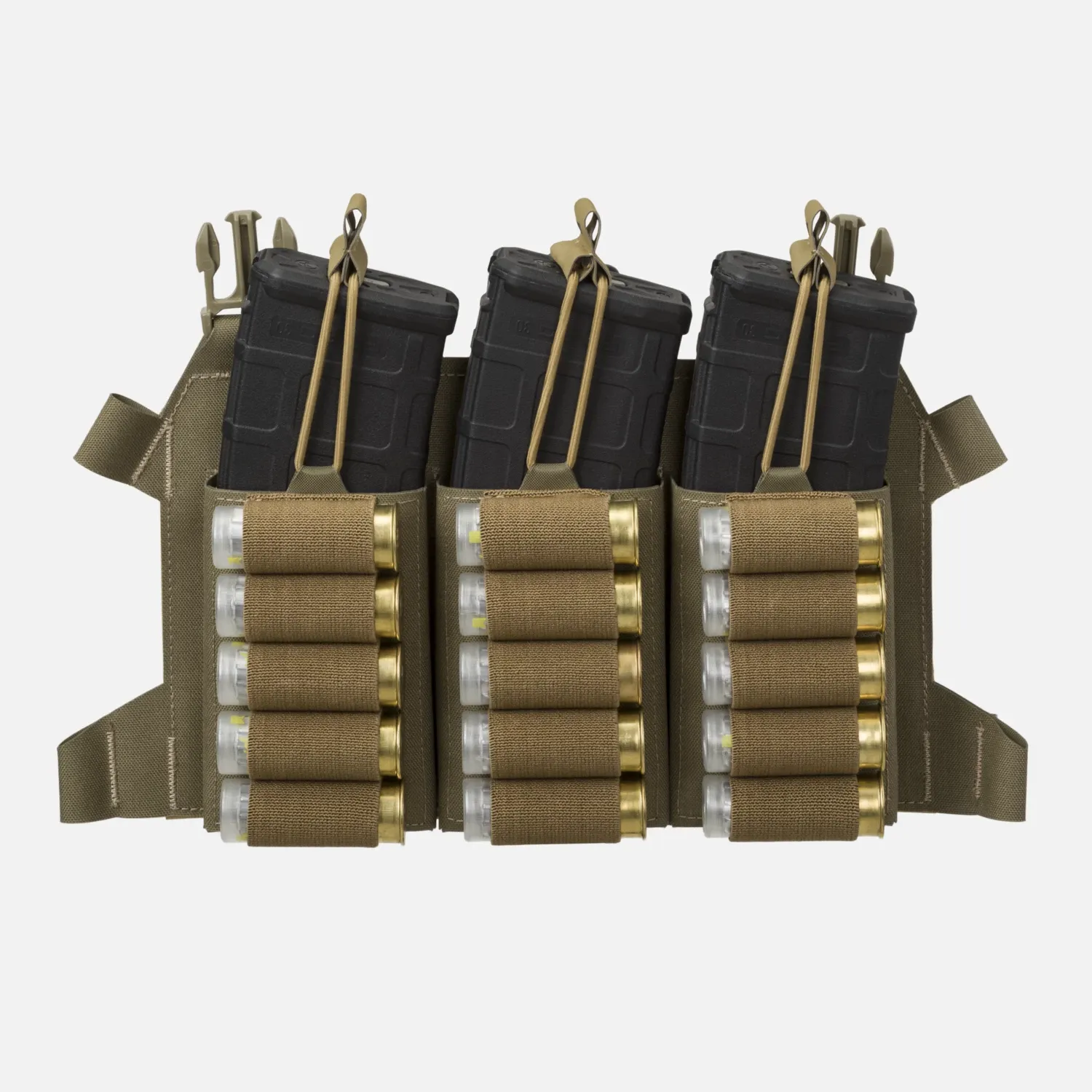 Чрезвычайно легкий, многофункциональный, со скелетированным клапаном, рассчитанный на три магазина M4/AR15 и до 15 патронов для дробовика. Эластичные петли с противоскользящей подкладкой Hypalon® разделяют патроны для дробовика на три секции по пять патронов в каждой. Разработан специально для нарушителей, которые используют дробовик в качестве дополнительного оружия. Клапан идеально подходит для платформы BEARCAT® и системы SPITFIRE®. Магазины закреплены сверху эластичным шнуром с ручками Hypalon®. Этот клапан можно превратить в компактное приспособление для ношения на груди с помощью дополнительного интерфейса.