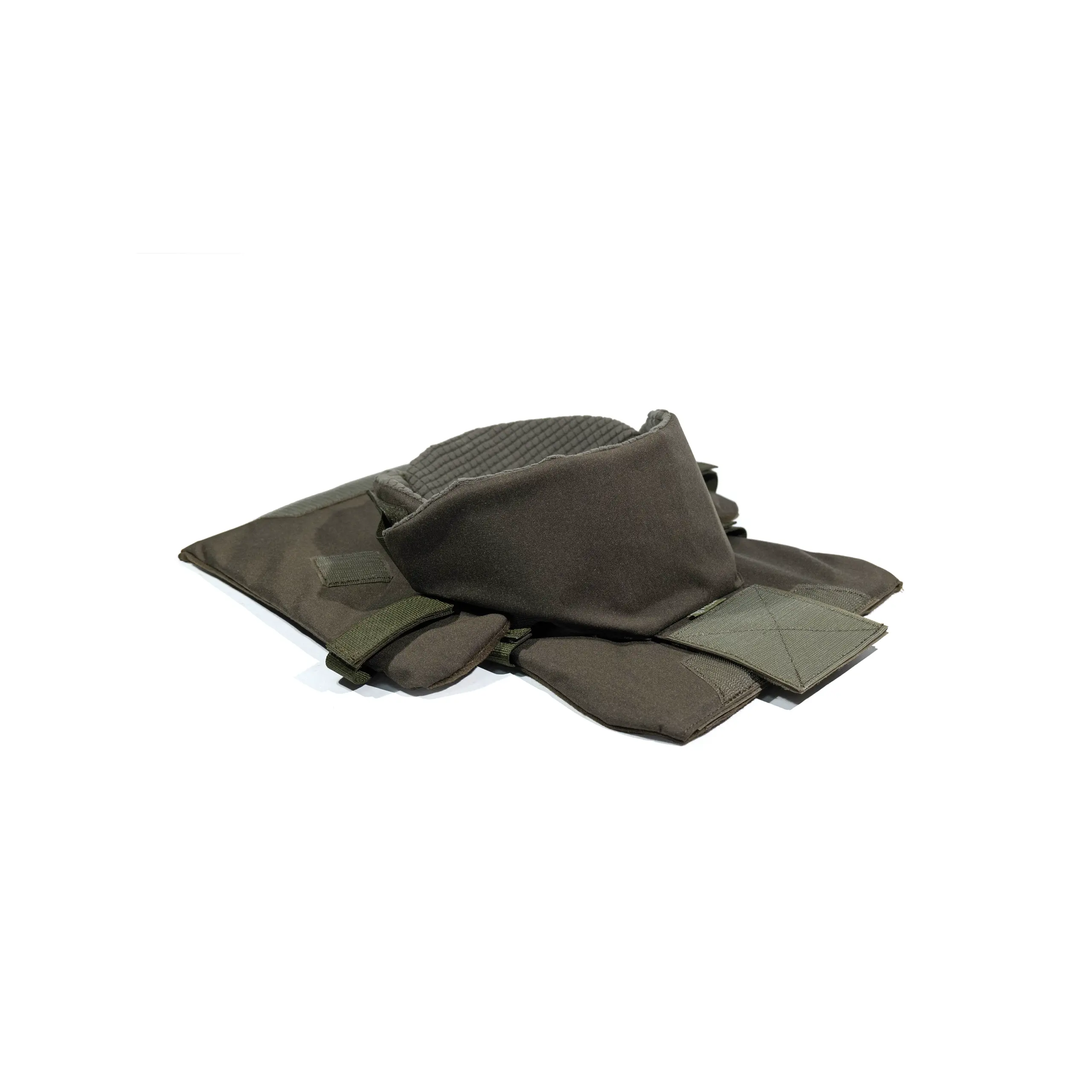 Баллистический модуль защиты шейно-воротниковой зоны тела, совместимый с большинством чехлов бронежилетов. Баллистические вставки можно извлекать для чистки или стирки чехла, а также замены наполнения. Часть, обращенная к телу выполнена из приятной коже ткани, которая значительно повышает комфорт во время эксплуатации, отводя пот и улучшая вентиляцию. Ткань не вбирает в себя песок во время переползаний и не натирает кожу. Модуль настраивается по объему и положению относительно чехла бронежилета. В изделии используются материалы с ИК-ремиссией.
