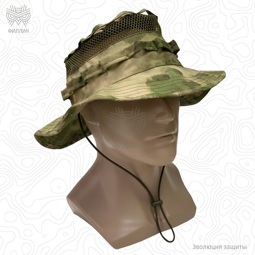 Панама для жаркого климата. Позволяет защитить голову от перегрева на солнце. Идеально подходит к маскировочным халатам «Туман». Не имеет размера — регулируется по объёму при помощи утяжки на затылке. Сверху и на боках панамы нашиты стропы из ткани для крепления листьев и травы, чтобы лучше соответствовать местности.