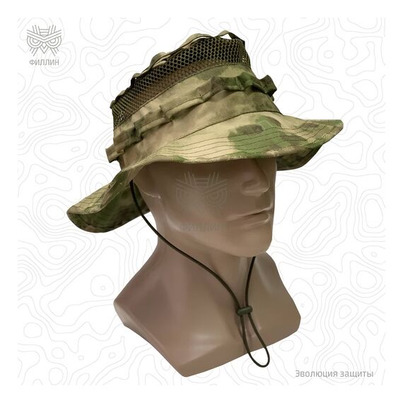 Панама для жаркого климата. Позволяет защитить голову от перегрева на солнце. Идеально подходит к маскировочным халатам «Туман». Не имеет размера — регулируется по объёму при помощи утяжки на затылке. Сверху и на боках панамы нашиты стропы из ткани для крепления листьев и травы, чтобы лучше соответствовать местности.