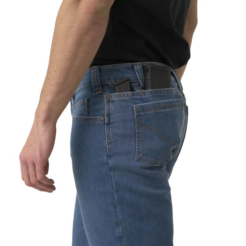 Джинсы Treadstone — это классические брюки, подходящие для повседневного использования, городских приключений и стрелковых тренировок. Они изготовлены из слегка эластичного материала DuraDenim, в котором волокна денима переплетены с волокнами Cordura, что повышает прочность и долговечность брюк, не влияя на их вес.