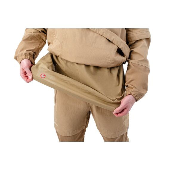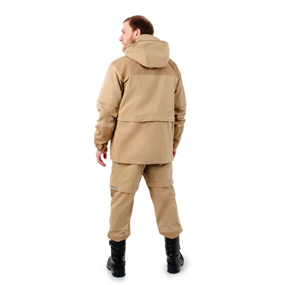 Состоит из куртки типа «анорак» с капюшоном и брюк прямого кроя. Костюм оснащен специальными ловушками для клещей, внутри куртки предусмотрен дополнительный слой хлопковой трикотажной ткани, которая заправляется в брюки для максимальной защиты от проникновения внутрь изделия. Низ куртки регулируется для дополнительного комфорта. Рукава оснащены плотными трикотажными манжетами. Капюшон с отстегивающейся противомоскитной сеткой, которая компактно укладывается в карман на груди. На куртке большой карман-кунгуру с 2-мя входами на молнии и влагозащитный карман под клапаном. Эластичный пояс со шлевками и внутренней резинкой гарантирует идеальную посадку. Низ брюк собран на резинку, что обеспечивает дополнительный комфорт во время движения. Два боковых кармана без застежки дополняют функциональность модели. Внутренние манжеты на штрипках позволяют заправлять брюки в ботинки для максимальной защиты. Этот костюм отлично подойдет для всех, кто часто и долго бывает в лесу. Для обеспечения безопасности в темное время суток вся печать на изделии является светоотражающей, а также имеются светоотражающие канты.