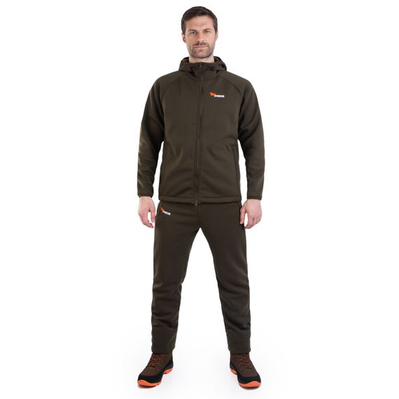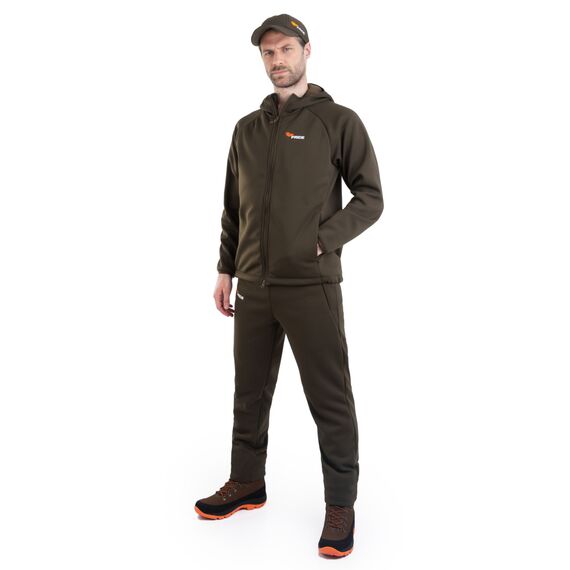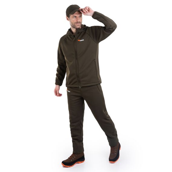 Костюм изготовлен из двухстороннего трикотажного полотна плотностью 280 г/м². С одной стороны он представляет собой гладкий трикотаж, а с другой — мягкий флис. Это сочетание обеспечивает комфорт и тепло, позволяя носить костюм в самых различных условиях.