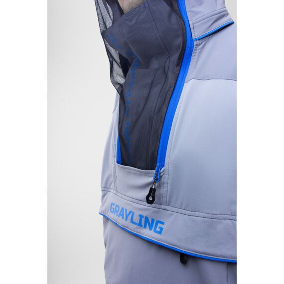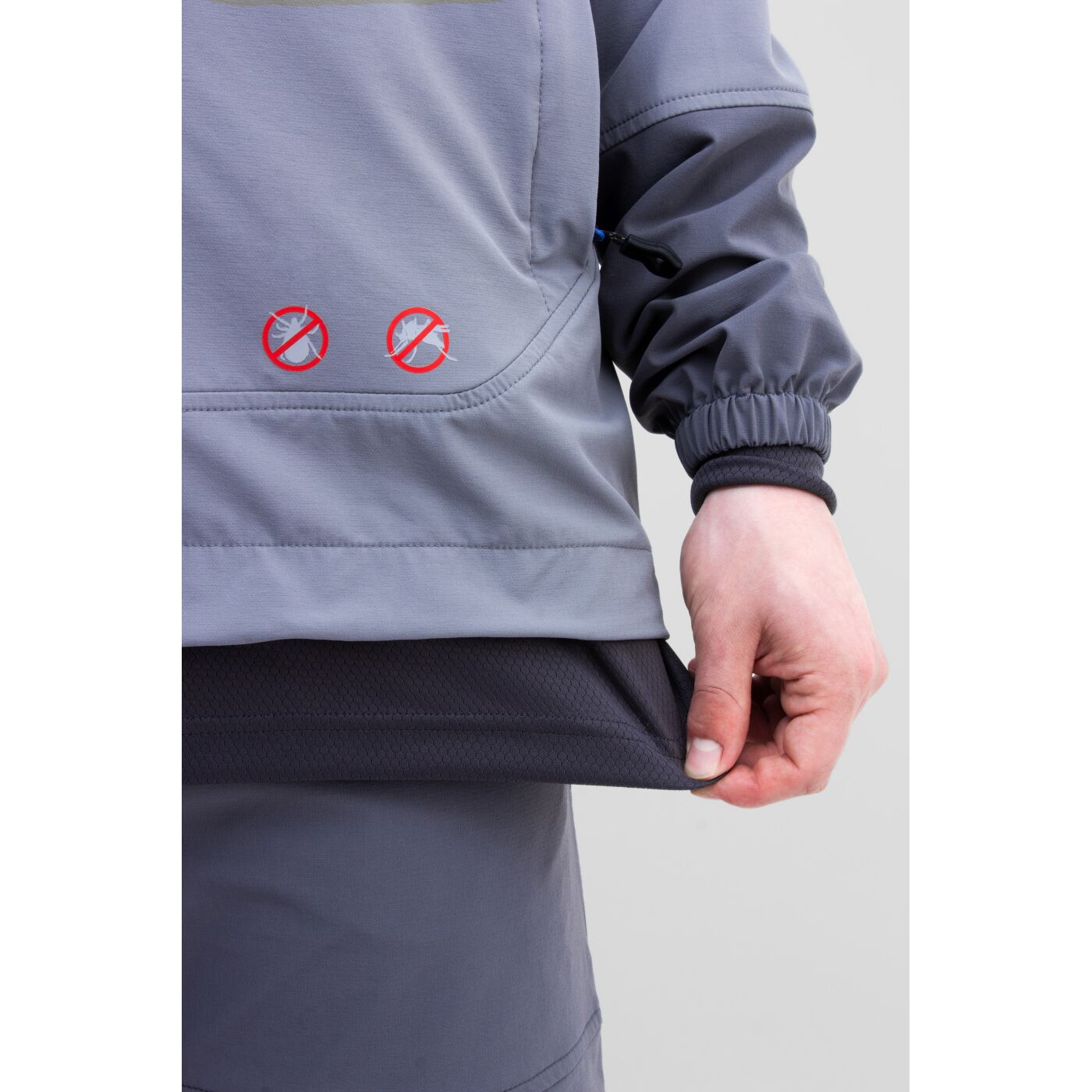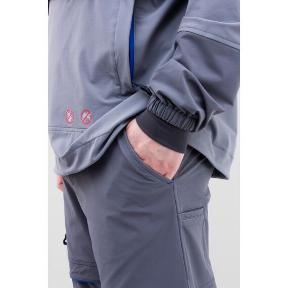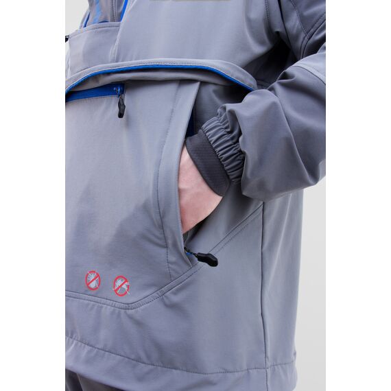 Летний костюм для рыбной ловли с внушительным набором средств механической защиты от насекомых: складки-ловушки, съемная противомоскитная сетка, противоэнцефалитная юбка и плотные манжеты. Состоит из анорака и брюк. Изготовлен из инновационного безмембранного однослойного софт-шелла с 4-х сторонней растяжимостью и водоотталкивающим эффектом. Ловушки и внутренние манжеты для защиты от проникновения насекомых под одежду. Интегрированный регулируемый в 2-х направлениях капюшон с отстегивающейся противомоскитной сеткой. Множество функциональных карманов: 3 на анораке и 5 на брюках. Регулировка низа анорака. Пояс брюк со встроенным эластичным ремнем на магнитной застежке
