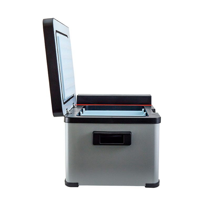 Libhof Q-18 — компактный компрессорный автомобильный холодильник, самая маленькая модель во всех линейках. Надёжная металлическая скоба на корпусе предназначена для фиксации на пассажирском сиденье с помощью ремней безопасности. Аналогичное крепление имеется у более объёмных моделей — Q-22 и Q-28.