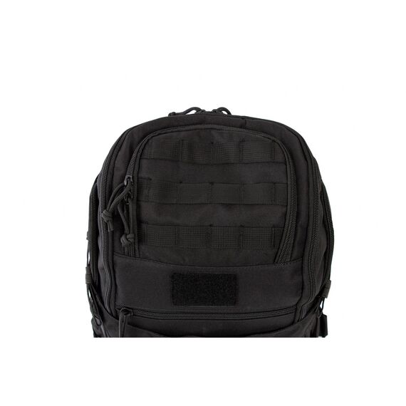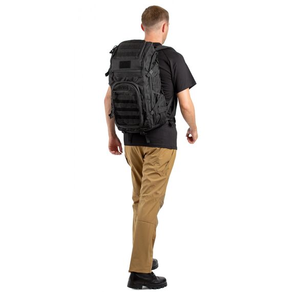 Рюкзак оснащен системой Molle/PALS для крепления подсумков, а также совместим с питьевой системой. Боковые утяжки с фастексами обеспечивают регулировку объема. Рюкзак оснащен эргономичной спинкой с широкими s- образными плечевыми лямками и поясным не съемным ремнем. Имеет основное объемное отделение, открывающееся на 180С, с органайзером на передней стенке.