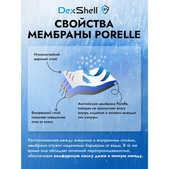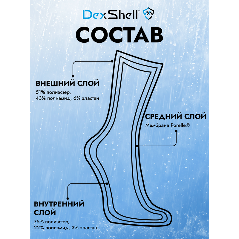 Изготавливаются они с применением шерсти мериноса и качественной мембраны Porelle, что даёт носкам такие свойства, как: воздухопроницаемость, защита от ветра и влаги, защита от загрязнений. К тому же, модель очень тёплая, идеально приспособлена под разные условия среды, особенно хороша для походов. Туристы непременно оценят данные носки. Они чрезвычайно комфортны в процессе носки, мягкие, приятные, безопасные для здоровья, гигиеничные. По этой причине многие категории потребителей отдают предпочтение марке Dexshell. Носки замечательно подойдут и для прогулок за городом, и для нахождения в городской среде.