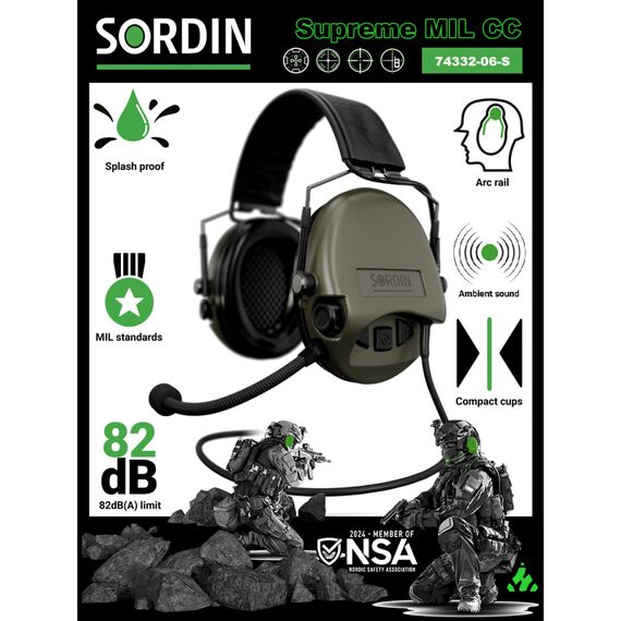Активные наушники MSA Sordin Supreme MIL CC для раций с кнопками Push-To-Talk это вершина линейки наушников для профессионального уровня использования совместно гарнитурами оснащенными функциями шумоподавления для самых тяжелых условий использования (службы специального назначения, вооруженные силы, пожарные, спасательные службы и прочее). Активные наушники MSA Sordin Supreme MIL CC обеспечивают высокую степень подавление шума, но при этом имеют очень компактный и эргономичный дизайн для совместного использования с шлемами и другим снаряжением. Благодаря микрофону и проводу подключения раций с кнопками Push-To-Talk Вы можете эффективно и безопасно общаться, а также слышать команды и инструкции, не снимая наушники и ведя стрельбу из оружия в боевом режиме. Активные наушники MSA Sordin Supreme MIL CC для раций с кнопками Push-To-Talk - это качество и надёжность в области электронной защиты слуха и прекрасное решение для охоты, спортивной стрельбы и тренировок. На левой чашке размещён микрофон с возможностью индивидуальной подстройки и соединительный кабель для устройств с разъёмом Nexus (J11 6,3 мм.). Модель складывается так компактно, что легко помещается в кармане. Соединительная дуга выполнена из высокопрочной пружинной стали покрытой влагозащитным лаком, отделана мягкой кожей, прекрасно выдерживает нагрузки кручения, излома и имеет удобную регулировку. Активные наушники MSA Sordin Supreme MIL CC для раций с кнопками Push-To-Talk - особенности: - водонепроницаемый отсек для батареек типа AAA - водонепроницаемые микрофоны для объемного слуха и оптимального расположения направления звука - микросхемы с алгоритмами ASIC - функция экономии заряда батареи, предупреждение о низком заряде батареи (40), автоматическое выключение через 4 часа, срок службы батареи 600 часов - ограничение уровня звука до безопасного 82 дБ - 2 динамика в каждой чашке: один для воспроизведения окружающих звуков и один для воспроизведения звука связи от рации (PTT). - воспроизведение звука от рации работает даже тогда, когда батареи внутри наушников разряжены - электроника полностью покрыта полимером для полной водонепроницаемости - тонкие чашки подходят для всех стрелков (левша / правша) - высокое усиление и естественное воспроизведение звука без искажения и пауз - дополнительная защита RFI - испытано и сертифицировано в соответствии с международными стандартами MIL MIL-STD-810g и EMC-MIL-STD-461G. Активные наушники MSA Sordin Supreme MIL CC для раций с кнопками Push-To-Talk - характеристики: снижение шума SNR 25 Дб.; конструкция - складная; водонепроницаемость - 100%; звуковое качество - stereo; звуковой предел снижения громких звуков - 82 децибела; разъём для рации - Nexus; микрофон с индивидуальной подстройкой; усиление слабых звуков - до 4 раз; настройка громкости - кнопки с запоминанием последней настройки; автоматическое отключение - через 4 часа; предупреждение о низком заряде батарей - за 40 часов до отключения; тип батарей - ААА или LR03; время работы батарей - 6...