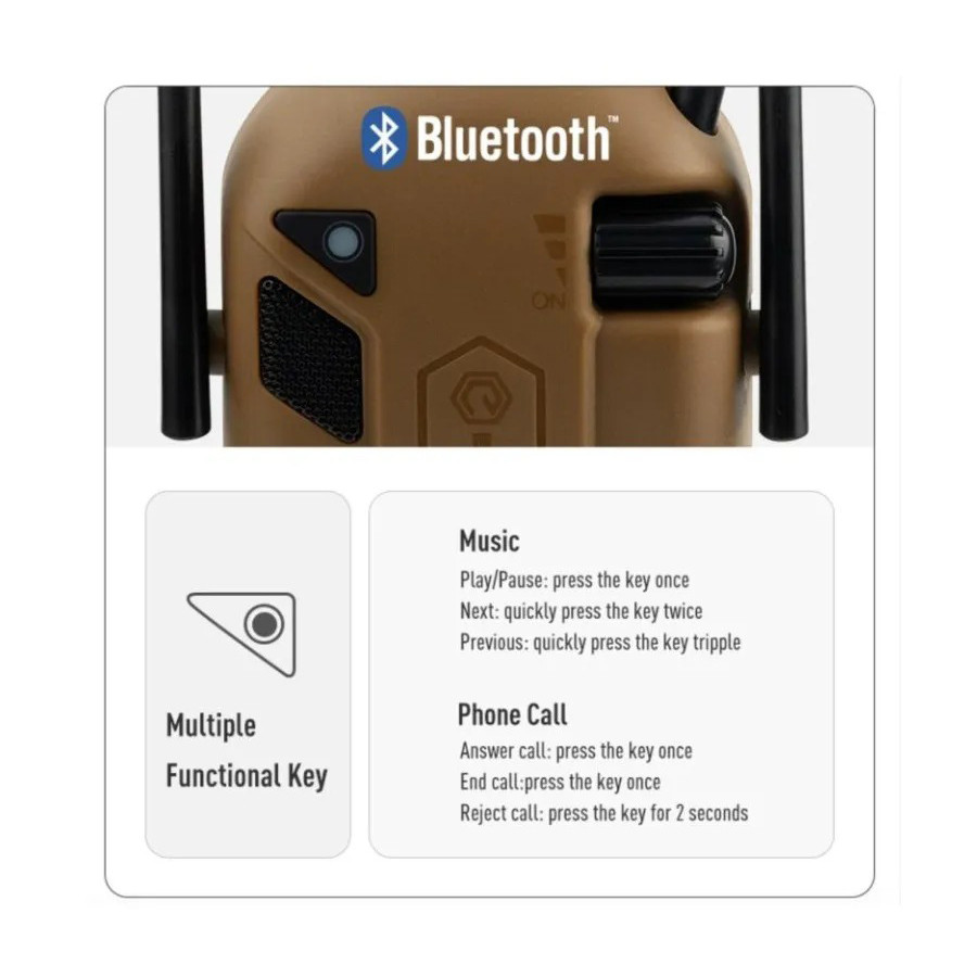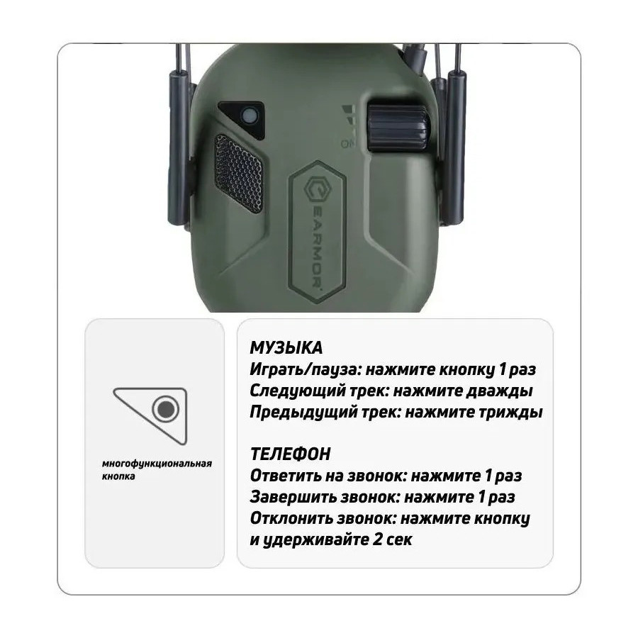 Гарнитура M300T Bluetooth Hearing Protection Tactical — это усовершенствованная тактическая гарнитура, разработанная для профессионального использования в суровых условиях. Эта гарнитура сочетает в себе передовую защиту органов слуха с передовыми технологиями беспроводной связи, что делает ее идеальной для военных операций, тактических миссий и интенсивной стрельбы. Bluetooth-подключение: обеспечивает беспроводное подключение к мобильным устройствам и системам связи, гарантируя бесперебойную связь и простоту эксплуатации без необходимости использования кабелей. Активная защита слуха: усовершенствованная технология активного шумоподавления защищает слух от громких шумов, одновременно усиливая тихие и важные звуки окружающей среды, обеспечивая безопасное общение и повышенную ситуационную осведомленность. Прочная конструкция. Эргономичный дизайн: удобная подкладка и регулируемая перемычка для головы обеспечивают комфорт даже при длительном ношении. Простые и интуитивно понятные элементы управления прямо на гарнитуре позволяют легко регулировать громкость и переключаться между режимами. Технические характеристики: Bluetooth 5.4 Блок питания ААА. Срок службы батареи: до 60 часов работы Шумоподавляющий эффект (ANSI): 22 дБ Вес: около 350 г. Водонепроницаемость: IPXX (не тестировалось) Температурная стойкость: от -20С до +60С Цвета: Доступны в черном, песочном (загорелом) и армейском зеленом цветах. Этот продукт является вершиной в своей категории, предлагая сочетание безопасности, комфорта и передовых технологий для взыскательного пользователя.