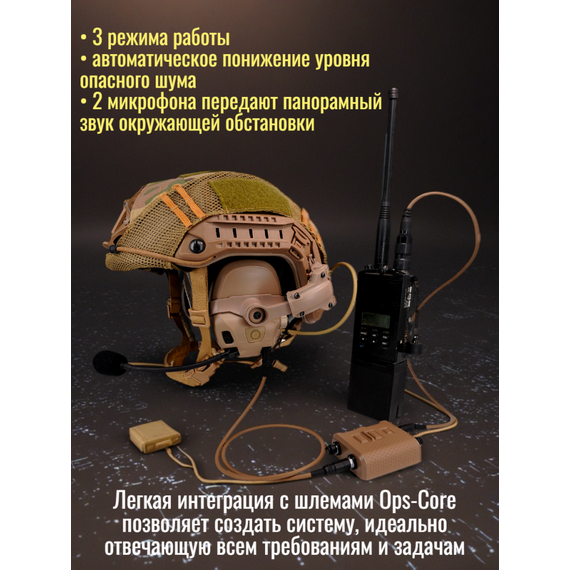 В тактической гарнитуре с шумоподавлением FMA FCS AMP используется собственно разработанная технология обработки панорамного звука в реальном окружении ТSFS (True Sound Field Situation). После того, как пользователь надел гарнитуру, она может эффективно улучшить слуховое восприятие звуковой обстановки на месте. Например, некоторые общие звуковые характеристики могут быть повышены, усилены или ослаблены (шаги, выстрелы, взрывы). В ходе различных испытаний и тестов было выявлено, что тактические отклики пользователей стали более точными и быстрыми. Гарнитура АМР имеет хорошую совместимость, использует подключаемый разъем стандарта НАТО и может осуществлять подключение и связь различных радиостанций с соответствующим модулем РТТ. Гарнитура поддерживает подключение микрофона слева и справа. Батарейки ААА помещаются по одной в батарейные отсеки с каждой стороны. Если гарнитура не используется в течение 4 часов, она автоматически отключается. Примечание: Стандартный кронштейн крепления совместим с направляющей FAST, а также может быть быстро снят и заменен. Шлемы Wendy 2.0 и 3.0 должны быть оснащены дополнительными адаптерами, чтобы обеспечить быструю замену соединительных элементов. Функции Шумоподавление 26 дБ. (NRR: 26 dB, H: 34 dB, M: 28 dB, L: 16 dB) Панорамное распознавание звука на 360°. Благодаря панорамной технологии обработки звука в реальном окружении TSFS, независимо разработанной FCS, гарнитура способна реализовать идентификацию и восприятие ориентации, а также автоматически различать тонкие звуки звукового поля, автоматически регулировать и усиливать определенные звуки, тем самым предоставляя больше деталей для тактического суждения. Возможность выбора режимов. Режим в помещении: стрельба в помещении или в замкнутом пространстве, дополнительно устраняется отраженный шум. Режим на улице: стрельба на открытом воздухе или на открытых площадках, исключаются короткие импульсные шумы. Режим прослушивания: ночью или в более тихой обстановке гарнитура может улавливать едва различимые звуки с большого расстояния и усиливать их в несколько раз для улучшения слухового восприятия. Двухканальная связь. Гарнитура может поддерживать подключение двух радиостанций одновременно для двухканальной связи. Конструкция с защитой от электромагнитных помех. Аппаратная часть соответствует отраслевым стандартам электромагнитной совместимости EMI и EMC, может эффективно избежать электромагнитных помех, создаваемых другим оборудованием. Технология защиты органов слуха для условий стрельбы. Адаптивная изоляция вредного звукового давления, эффективная защита слуха. Критическая точка срабатывания автоматической электронной защиты от звукового давления: около 85 дБ. Быстросъемная конструкция. Конструкция с возможностью быстрой разборки и замены позволяет без повреждений разобрать и собрать оголовье и быстро заменить его на кронштейны крепления для рельс шлема, чтобы реализовать совместимость с ношением шлема. Дополн...