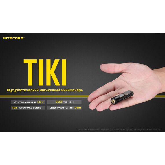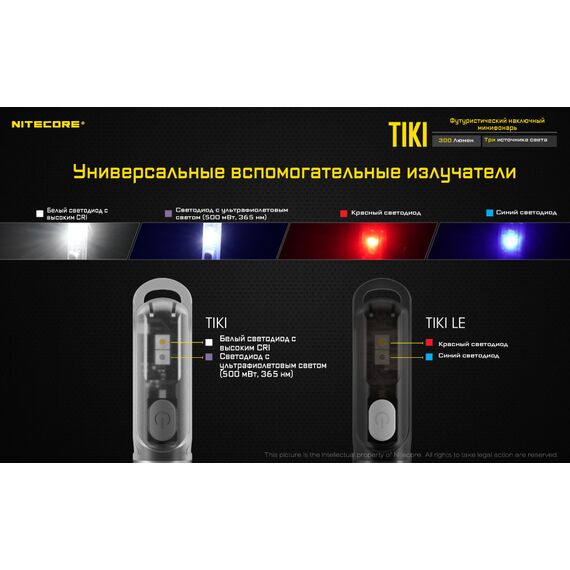 Повседневный фонарь-брелок Nitecore TIKI LE дает мягкий свет мощностью до 300 люмен благодаря светодиоду OSRAM P8 и невероятно гладкому рефлектору. Прозрачный корпус фонаря изготовлен из прочного поликарбоната, часто используемого в аэрокосмической промышленности. Поэтому ультракомпактный, легкий футуристичный TIKI LE так удобно держать в руке. Голова фонаря из алюминиевого сплава отлично рассеивает избыточное тепло. TIKI LE оснащен дополнительным красным и синим светодиодом. Они могут быть использованы как маркер местоположения различных групп людей и как сигнальный маяк для кемпинга или во время прогулки или для привлечения внимания приближающихся транспортных средств или пешеходов во избежание потенциальной опасности. Интуитивно-простое управление одной кнопкой. Во избежание случайного включения фонаря применена следующая схема управления: нажатие и удержание кнопки активирует режим максимальной яркости; быстрое двойное нажатие включает фонарь; быстрое тройное нажатие активирует вспомогательное освещение. До 40 часов работы, подзарядка через USB. TIKI LЕ оснащен технологией автоматического отключения, благодаря которой фонари готовы к работе до 365 дней от одной зарядки. Интегрированный аккумулятор емкостью 130 мАч обеспечивает до 40 часов непрерывной работы, что сопоставимо по эффективности батарейке ААА. Благодаря нескольким системам защиты при зарядке фонарь можно заряжать от различных источников питания даже во время использования. Характеристики: Максимальная яркость: 300 люмен; Максимальная дальность: 71 метр; Максимальная интенсивность: 1260 cd; Время работы: 40 часов; Светодиод: OSRAM P8 LED; Питание: Li-ion; Специальные режимы: Red/Blue Warning Light. Размеры: Длина: 55 мм Размер головы: 14.7 мм. Вес: 12 г. Режимы: Высокий - 300 люмен, 30 мин.; Средний - 60 люмен, 1 ч.; Низкий - 15 люмен, 4 ч.; Экономный - 1 люмен, 40 ч; Красный - 3 люмена, 1 ч.; Синий - 0.8 люмена, 45 мин.; Красно-синий маяк - 1 ч. 45 мин. Внимание! Рекомендуем заряжать встроенный аккумулятор каждые 3 месяца, даже если фонарь не используется в этот период!