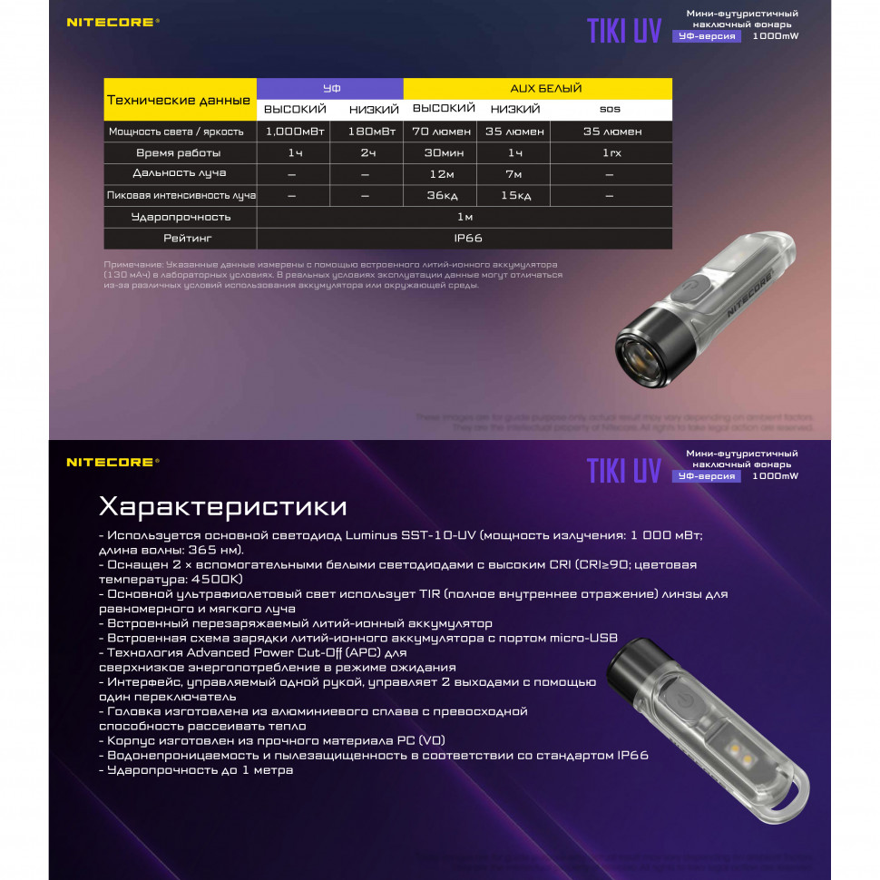 В Nitecore TIKI UV применен светодиод Luminus SST-10-UV с длиной волны 365 нм и максимальной мощностью излучения 1000 мВт и линза TIR с полным внутренним отражением для равномерного и мягкого луча. Ультрафиолетовый луч оптимизирован с высокой эффективностью для безопасного использования. Ультрафиолетовый свет 365 нм идеально подходит для проверки купюр, судмедэкспертизы, проверки утечек бензина и геммологической оценки, а также для зарядки фосфоресцирующих материалов, обнаружения стригущего лишая, аномалий кожи, исследования документов, привлечения насекомых и обнаружения оптического отбеливателя. TIKI UV также оснащен дополнительными белыми светодиодами с высоким индексом цветопередачи, которые можно использовать для ближнего освещения, чтения или кемпинга. Режим маячка подойдет для обозначения или привлечения внимания, чтобы гарантировать безопасность в ночное время. Прозрачный матовый корпус из прочных материалов PC (V0), которые обычно используются в аэрокосмической и электронной промышленности, и головка из алюминиевого сплава делают TIKI UV сверхминиатюрным, легким (всего 10,5 г) и футуристическим гаджетом с удобным и устойчивым захватом. У TIKI UV удобное управление одной кнопкой. Во избежание случайного включения реализована схема переключения между режимами путем нескольких нажатий или удержания кнопки. TIKI UV оснащен технологией APC (Advanced Power Cutoff) со сверхнизким энергопотреблением 1 мкА в режиме ожидания, что обеспечивает 365-дневную работу в режиме ожидания. Встроенный литий-ионный аккумулятор емкостью 130 мАч имеет сравнимую эффективность с батареей AAA и обеспечивает 2 часа работы в ультрафиолетовом свете. Благодаря нескольким системам защиты можно продолжать использовать TIKI UV даже во время подзарядки от любого внешнего источника питания через разъем micro-USB. Особенности: ультрафиолетовый светодиод Luminus SST-10-UV с длиной волны 365 нм и максимальной мощностью излучения 1000 мВт 2 дополнительных белых светодиода с высоким индексом цветопередачи линза TIR с полным внутренним отражением для равномерного и мягкого луча встроенный перезаряжаемый литий-ионный аккумулятор емкостью 130 мАч технология APC обеспечивает до года работы в режиме ожидания удобное управление одной кнопкой голова из алюминиевого сплава с высокой теплоотдачей прозрачный матовый корпус из прочных материалов PCзащита от воды и пыли стандарта IP66 ударопрочность при падении с высоты до 1 м. Режимы: Высокий УФ - 1000 мВт, 1 ч Низкий УФ - 180 мВт, 2 ч Высокий - 70 люмен, 30 мин. Низкий - 35 люмен, 1 ч Маяк - 35 люмен, 11 ч. Внимание! Рекомендуем заряжать встроенный аккумулятор каждые 3 месяца, даже если фонарь не используется в этот период!