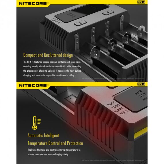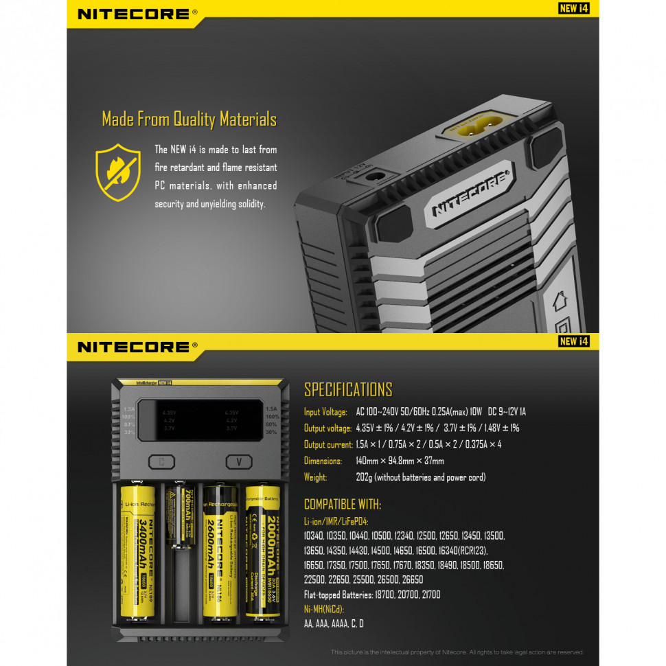 Если Вам нужно одновременно зарядить 2 разных типа аккумуляторов (например, 18650 и 16340), вовсе необязательно использовать под каждый элемент питания определенное зарядное устройство (ЗУ). Ведь гораздо проще установить эти аккумуляторы в одно универсальное ЗУ, способное одновременно заряжать разнотипные аккумуляторы - Nitecore NEW I4. NEW I4 имеет 4 независимых друг от друга канала питания, с помощью которых Вы сможете заряжать одновременно до 4-х аккумуляторов. Благодаря встроенному микропроцессору, зарядное устройство автоматически определит тип установленного элемента питания и будет подавать на него необходимое напряжение до тех пор, пока аккумулятор не зарядится до 100%. Затем зарядка автоматически прекратится. Встроенный LED-дисплей поможет Вам следить за прогрессом зарядки, также на нём будут отображаться соответствующие уведомления об окончании зарядки или ошибке (в случае неправильной установки аккумулятора или установки неперезаряжаемого элемента питания). Особенности: 4 полностью независимых друг от друга слота зарядки; Максимальная сила тока, подаваемая одновременно на один слот – 1500 мА / на два слота – 750/500 мА / на четыре слота – 375 мА; Интегрированный микропроцессор автоматически определяет тип установленных элементов питания, их емкость и подаст наиболее подходящее напряжение; Nitecore NEW I4 подходит для зарядки аккумуляторов следующих типов: Ni-CD и Ni-MH, Li-Ion, IMR и LiFePO4; Nitecore NEW I4 может использоваться для восстановления полностью севших IMR-аккумуляторов; Встроенная защита от перезаряда автоматически прекратит подачу тока на полностью заряженные элементы питания; На интегрированном LED-дисплее отображается актуальная информация касательно текущего уровня заряда аккумулятора и различные уведомления; Защита от обратной полярности не позволяет давать ток на неправильно установленные элементы питания (на дисплее загорится соответствующий индикатор); NEW I4 может работать от сети 220 или 12 В (например, от автомобильного прикуривателя); Корпус из огнеупорных ABS материалов. Характеристики: ВХОД: AC 100 ~ 240V 50 / 60Hz 0.25A (макс.) 10 ВтDC 9 ~ 12V 1A; ВЫВОД: 4.35V ± 1% / 4.2V ± 1% / 3,7 ± 1% / 1.48V ± 1%1.5A × 1 / 0.75A × 2 / 0.5A × 2 / 0.375A × 4. Совместимость с аккумуляторами: Li-Ion / IMR / LiFePO4: 10340, 10350, 10440, 10500, 12340, 12500, 12650, 13450,13500, 13650, 14350, 14430, 14500, 14650, 16500, 16340 (RCR123),16650, 17350, 17500, 17650, 17670, 18350, 18490, 18500,18650, 22500, 22650, 25500, 26500, 26650. Так же аккумуляторы без платы защиты с плоским верхом: 18700, 20700, 21700. Ni-MH(NiCd): AA, AAA, AAAA, C, D.