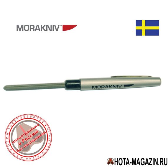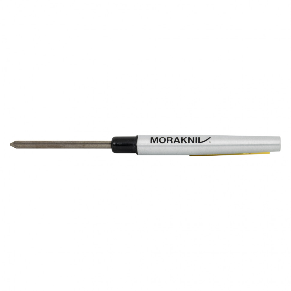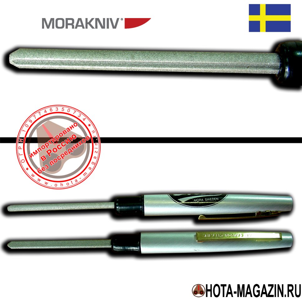 Оригинальная заточка в виде стержня. Колпачок как у шариковой ручки позволяет пристегивать точило к карману или ремню. Универсальная форма бруска позволяет легко заточить вещи с ровными лезвиями, а также, получившие широкое распространение зубчатые ножи и рыболовные крючки - на стержне совмещены три варианта поверхности: круглая, плоская, и клинообразная выемка. Характеристики заточка MORA Diamond Shapener S: габариты - 14х1 см.; размеры алмазной части - 53х4 мм.; вес - 110 г.