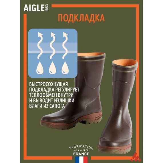 Особенности сапог Aigle 2 поколения: - новый рисунок протектора подошвы обеспечивает еще большее сцепление - новый дизайн с отображением фирменных логотипов - уникальная запатентованная система амортизации в подошве, не имеющая аналогов в мире Технологии: Gomma Plus: результатом продолжительных обширных исследований и испытаний компании AIGLE стал материал Gomma Plus, который является смесью натурального каучука со специальными добавками, что позволяет интенсивно использовать сапоги из этого материала в течение долгого времени даже в условиях контакта с активными минеральными и химическими веществами (очень важно для использования в сельском хозяйстве). Устойчивость Gomma Plus к воздействию озона придаёт ему долговечность, в разы превосходящую другие аналоги, – резина теряет эластичность и стареет в геометрической прогрессии, а Gomma Plus служит долгие годы. Softex: пористый материал из полиамида обладает наилучшей способностью поглощать пот. Очень комфортно при использовании, но главное просто незаменимо в случае намокании внутренней части сапог (самое быстрое высыхание без ощущения сырости и холода). Sanitized: запатентованная фирмой AIGLE добавка для внутренних частей сапог. Она обладает антибактериальными и гигиеническими свойствами, которые защищают сапоги от образования плесени (все знают неприятный запах резиновых сапог) и делают непригодной среду для жизни микроорганизмов (ведь чего только не зачерпнешь вместе с водой). Уникальность добавки в том, что она не вымывается при многократном воздействии водой и моющими средствами. Actigrip: Подошва Actigrip создана фирмой AIGLE по уникальной технологии с учётом 150-летнего опыта производства сапог из каучука. Результатом столь долгих изысканий стала подошва, обладающая исключительной эластичностью (подошва-амортизатор), твердостью, устойчивостью, а главное она не скользит. Сегодня эта технология используется в линейке сапог Parcours, которая сочетает все различные комбинации последних новаций. Эти подошвы в сочетании с разным протектором (как правило, само очищающимся при ходьбе) обеспечивают уверенность в движении даже на скользких камнях покрытых илом.