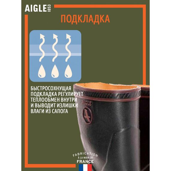 Особенности сапог Aigle 2 поколения: - новый рисунок протектора подошвы обеспечивает еще большее сцепление - новый дизайн с отображением фирменных логотипов - уникальная запатентованная система амортизации в подошве, не имеющая аналогов в мире Технологии: Gomma Plus: результатом продолжительных обширных исследований и испытаний компании AIGLE стал материал Gomma Plus, который является смесью натурального каучука со специальными добавками, что позволяет интенсивно использовать сапоги из этого материала в течение долгого времени даже в условиях контакта с активными минеральными и химическими веществами (очень важно для использования в сельском хозяйстве). Устойчивость Gomma Plus к воздействию озона придаёт ему долговечность, в разы превосходящую другие аналоги, – резина теряет эластичность и стареет в геометрической прогрессии, а Gomma Plus служит долгие годы. Softex: пористый материал из полиамида обладает наилучшей способностью поглощать пот. Очень комфортно при использовании, но главное просто незаменимо в случае намокании внутренней части сапог (самое быстрое высыхание без ощущения сырости и холода). Sanitized: запатентованная фирмой AIGLE добавка для внутренних частей сапог. Она обладает антибактериальными и гигиеническими свойствами, которые защищают сапоги от образования плесени (все знают неприятный запах резиновых сапог) и делают непригодной среду для жизни микроорганизмов (ведь чего только не зачерпнешь вместе с водой). Уникальность добавки в том, что она не вымывается при многократном воздействии водой и моющими средствами. Actigrip: Подошва Actigrip создана фирмой AIGLE по уникальной технологии с учётом 150-летнего опыта производства сапог из каучука. Результатом столь долгих изысканий стала подошва, обладающая исключительной эластичностью (подошва-амортизатор), твердостью, устойчивостью, а главное она не скользит. Сегодня эта технология используется в линейке сапог Parcours, которая сочетает все различные комбинации последних новаций. Эти подошвы в сочетании с разным протектором (как правило, само очищающимся при ходьбе) обеспечивают уверенность в движении даже на скользких камнях покрытых илом.