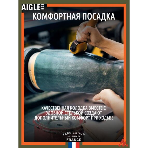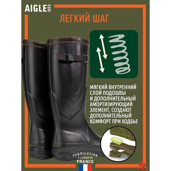Высокие сапоги (до колена) из натурального каучука. Специальная застёжка сбоку облегчает процесс снятия и надевания и позволяет регулировать ширину голенища (специальная непромокаемая вставка). Внутри подкладка (быстросохнущая) со специальной антибактериальной пропиткой против образования плесени, и неприятного запаха внутри сапога(который свойственен большинству аналогов). Подошва изготовлена из смеси каучука и полимера - это увеличивает эластичность и износостойкость. Конструкция сапога: Подошва состоит из трех частей: протекторной, амортизационной и дополнительный массажирующий амортизатор в пятке. Сверху сапога вставка в виде расширителя для заправки брюк и удобной регулировки размера икры. Расширитель сделан из дополнительного слоя каучука. От икры до подошвы идет 2 слоя каучука. Голеностоп сделан из 3 слоев каучука. Пятка и носок сделаны из 4 слоев каучука. Вдоль всей подошвы на высоту 1 см. усиление пятым слоем каучука. Сборочный шов сзади закрыт полосами из каучука в 2 слоя. Особенности сапог Aigle 2 поколения: - новый рисунок протектора подошвы обеспечивает еще большее сцепление - новый дизайн с отображением фирменных логотипов - уникальная запатентованная система амортизации в подошве, не имеющая аналогов в мире Технологии: Gomma Plus: результатом продолжительных обширных исследований и испытаний компании AIGLE стал материал Gomma Plus, который является смесью натурального каучука со специальными добавками, что позволяет интенсивно использовать сапоги из этого материала в течение долгого времени даже в условиях контакта с активными минеральными и химическими веществами (очень важно для использования в сельском хозяйстве). Устойчивость Gomma Plus к воздействию озона придаёт ему долговечность, в разы превосходящую другие аналоги, – резина теряет эластичность и стареет в геометрической прогрессии, а Gomma Plus служит долгие годы. Softex: пористый материал из полиамида обладает наилучшей способностью поглощать пот. Очень комфортно при использовании, но главное просто незаменимо в случае намокании внутренней части сапог (самое быстрое высыхание без ощущения сырости и холода). Sanitized: запатентованная фирмой AIGLE добавка для внутренних частей сапог. Она обладает антибактериальными и гигиеническими свойствами, которые защищают сапоги от образования плесени (все знают неприятный запах резиновых сапог) и делают непригодной среду для жизни микроорганизмов (ведь чего только не зачерпнешь вместе с водой). Уникальность добавки в том, что она не вымывается при многократном воздействии водой и моющими средствами. Actigrip: Подошва Actigrip создана фирмой AIGLE по уникальной технологии с учётом 150-летнего опыта производства сапог из каучука. Результатом столь долгих изысканий стала подошва, обладающая исключительной эластичностью (подошва-амортизатор), твердостью, устойчивостью, а главное она не скользит. Сегодня эта технология используется в линейке сапог Parcours, которая сочетает все различные комбинации последних новаций. Эти подошвы в соче...