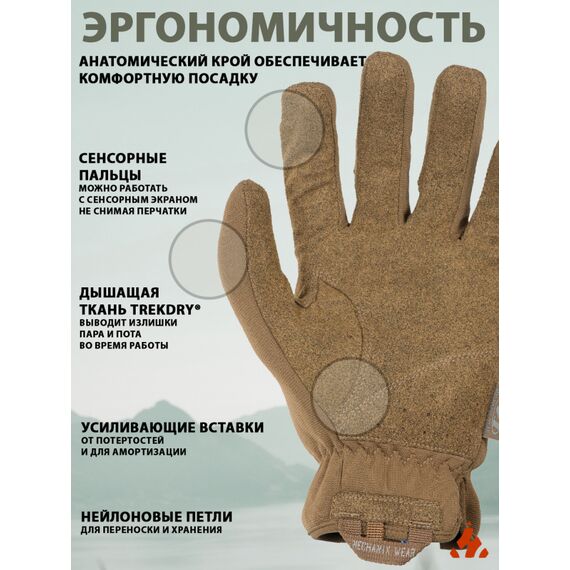 Тактические перчатки с сенсорными вставками MECHANIX FastFit Coyote позволяют управлять устройством с помощью высококачественной синтетической кожи толщиной 0,6 мм. и оставаться на связи благодаря технологии полного покрытия ладони сенсорным материалом. Тактические перчатки с сенсорными вставками MECHANIX FastFit обеспечивают непревзойденную посадку благодаря охлаждающему материалу TrekDry и прочным петлям для переноски и хранения в полевых условиях. Тактические перчатки с сенсорными вставками MECHANIX FastFit Coyote - особенности: - дышащий материал TrekDry сохраняет прохладу и комфорт ваших рук. - эластичные манжеты обеспечивают надежную посадку. - анатомически сконструированная ладонь, состоящая из двух частей, исключает скопление материала и образование складок и сборок. - защемленная конструкция кончика пальца повышает прочность и долговечность кончиков пальцев. - высококачественная синтетическая кожа толщиной 0,6 мм с технологией взаимодействия с сенсорными экранами. - нейлоновые петли для переноски и хранения. - можно стирать в машине. Перчатки MECHANIX FastFit Coyote - сферы использования: воруженные силы правоохранительные органы стрелковый спорт производство и бытовое использование
