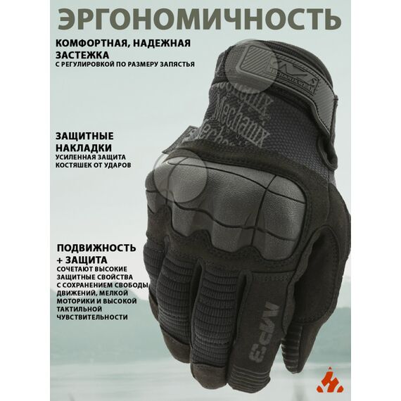 Тактические перчатки с защитой пальцев MECHANIX M-Pact 3 Black лучший вариант защиты в полевых условиях. Последнее поколение тактических перчаток MECHANIX M-Pact 3 Black обеспечивает защиту военных и сотрудников правоохранительных органов от ударов по стандарту EN 13594 во многих странах мира. Управляйте устройствами с сенсорными экранами с помощью синтетической кожи толщиной 0,8 мм. и оставайтесь на связи с сенсорным экраном. Модель перчаток MECHANIX M-Pact 3 Black, представляющая из себя дальнейшее развитие проверенного функционала MECHANIX M-Pact, является моделью с большей ориентацией на полевое специализированное использование. Эта модель – хороший выбор защиты рук для сотрудников армейских и правоохранительных структур, специфика работы которых предполагает длительное пребывание в полевых условиях. Конструкция модели в силу специфики применяемых материалов предполагает хорошие защитные свойства с сохранением хорошей свободы движений и действий, мелкой моторики и высокой тактильной чувствительности – в основном, благодаря использованию более анатомической (приспособленной к особенностям структуры человеческой руки) жёсткой защиты. Более плотные слои абсорбционных и демпфирующих материалов хорошо гасят ударные и вибрационные нагрузки, которые неизбежно возникают при использовании огнестрельного оружия (для чего были дополнительно добавлены абсорбционные зоны в области пальцев) либо при выполнении иных операций со снаряжением. Перчатки имеют улучшенную фиксацию на запястье, улучшена посадка перчаток по ладони пользователя. Кроме того, в области запястье была добавлена петля из нейлоновой стропы – для фиксации перчаток к снаряжению пользователя. Тактические перчатки с защитой пальцев MECHANIX M-Pact 3 Black - особенности: - защита от ударов из термопластичной резины (TPR) соответствует стандарту EN 13594 impact standard. - застежка из термопластичной резины (TPR) обеспечивает надежную фиксацию на запястье. - амортизирующая прокладка из EVA снижает ударную нагрузку на большой палец и пальцы. - внутреннее усиление кончиков пальцев обеспечивает дополнительную прочность и долговечность там, где это необходимо больше всего. - синтетическая кожа для работы с сенсорным экраном толщиной 0,8 мм. обеспечивает идеальное сочетание гибкости и защиты. - нейлоновые несущие петли. - можно стирать в машине. Перчатки MECHANIX M-Pact 3 Black - сферы использования: вооруженные силы правоохранительные органы стрелковый спорт спасательные службы производство и бытовое использование