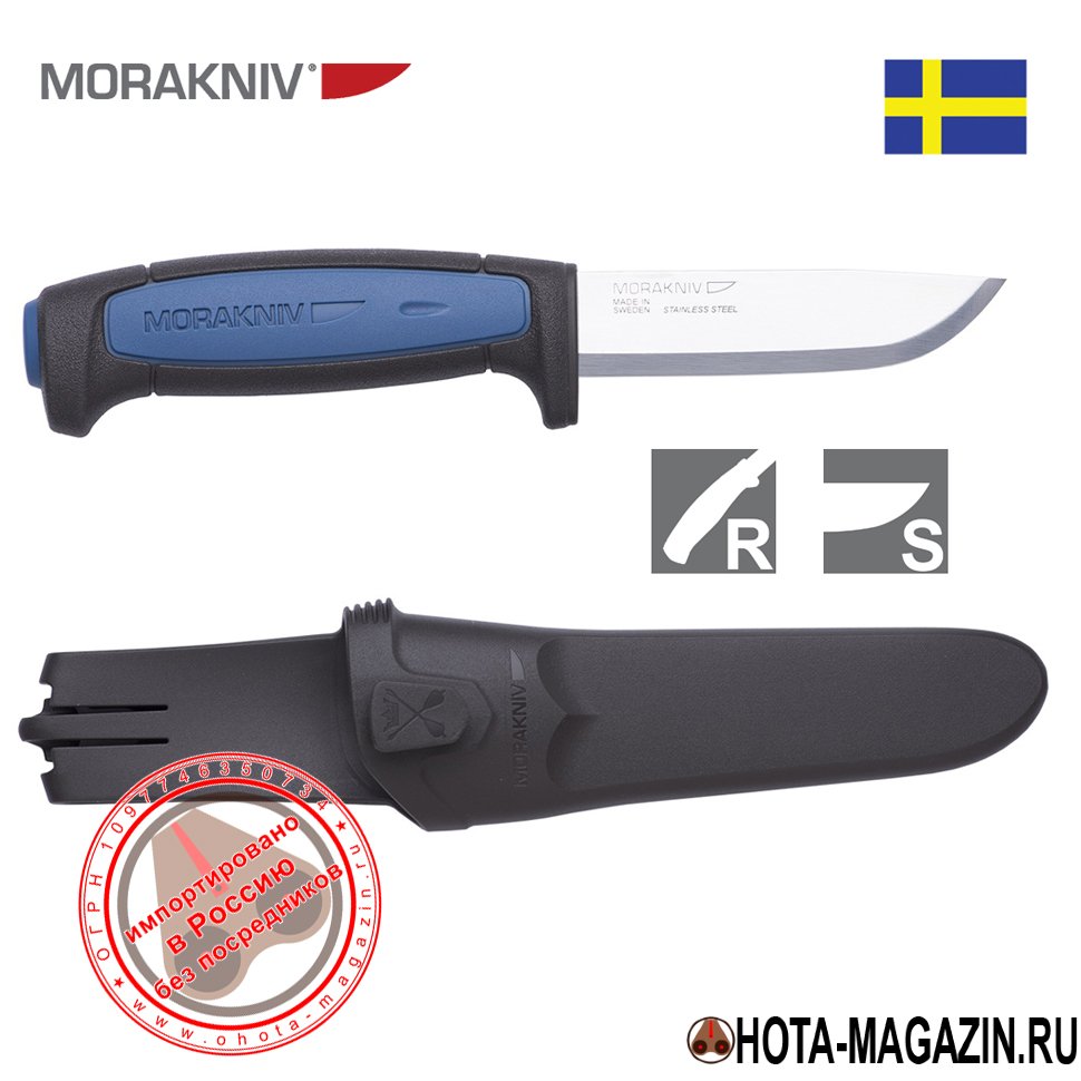 Нож Morakniv Pro S широко используется как универсальный нож для любых работ на промышленном производстве и в повседневных бытовых целях в домашней обстановки. Пластиковая прорезиненная рукоять не выскальзывает, а пластиковые ножны оборудованы двойным креплением к ремню и монтажному поясу. Характеристики ножа Morakniv Pro S: длина клинка - 91 мм.; длина ножа - 204 мм.; ширина клинка - 23 мм. (max); толщина размер - 2 мм.; сталь - нержавеющая Sandvik (54-56 HRC); рукоять - прорезиненный пластик; ножны - пластик; размеры в собранном виде - 22,5x4,5x4,5 см.; вес - 81 гр. Нож Morakniv Pro S купить в Москве с доставкой по России лучше всего у нас - прямого импортера в Россию от производителя Mora (подтверждается наличием сертификата). Вы будете защищены от рисков покупки подделки, контрабандного товара или некачественного товара с браком.