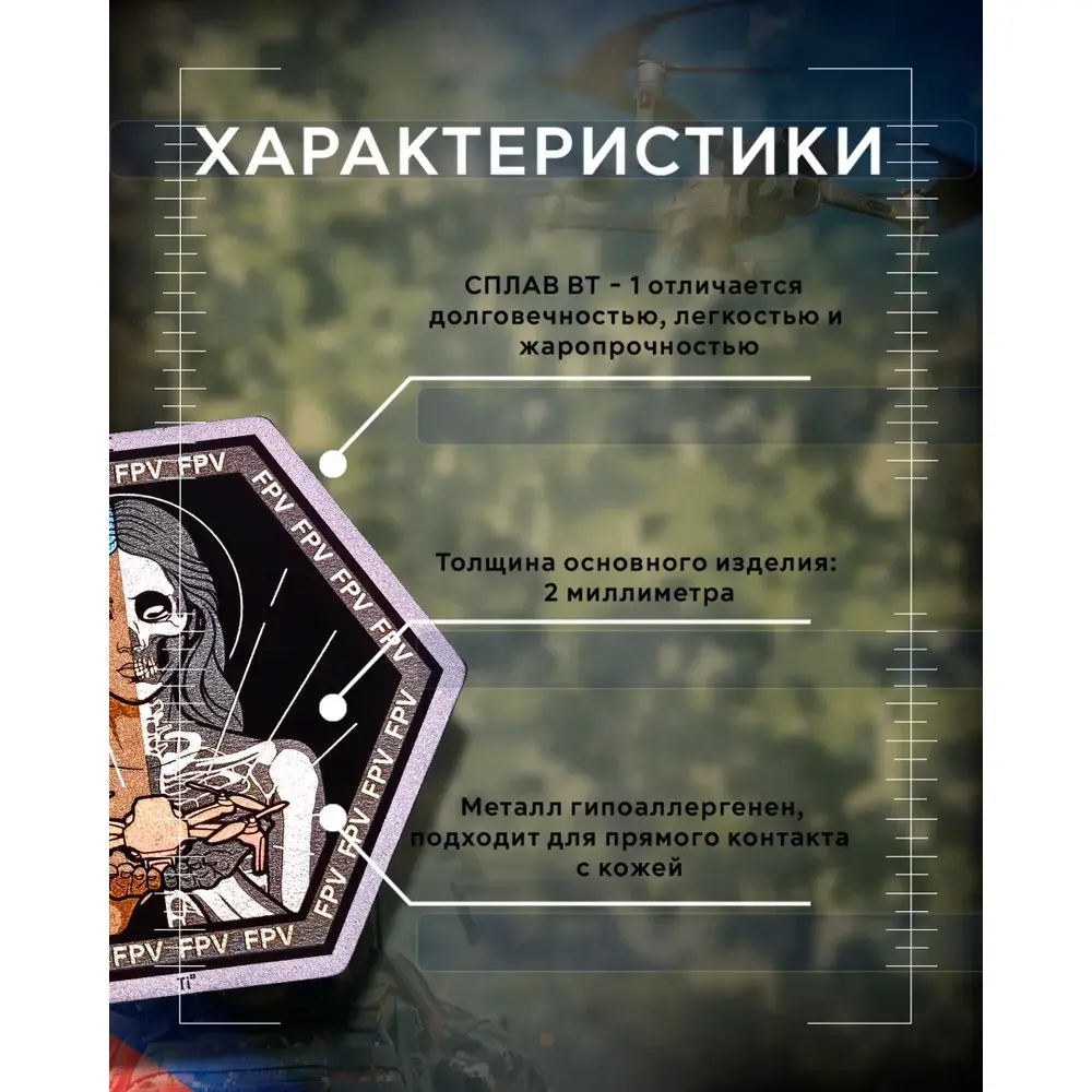 Патч с Военным Духом! Эксклюзивная лазерная гравировка на прочном титане. Уникальные дизайны для операторов FPV дронов, пехоты, ВДВ и ценителей милитари-стиля. Надежное и долговечное украшение для экипировки или повседневного аксессуара! Характеристики Размер 46x40x2 мм | Титан | Комплект Велкро (основа+липучка) | Нашивка на липучке Стильный и уникальный аксессуар Металлический патч Подразделения FPV-дронов "Небесный Судья" – уникальная нашивка из титана с лазерной детализацией. Липучка велкро обеспечивает удобное крепление.