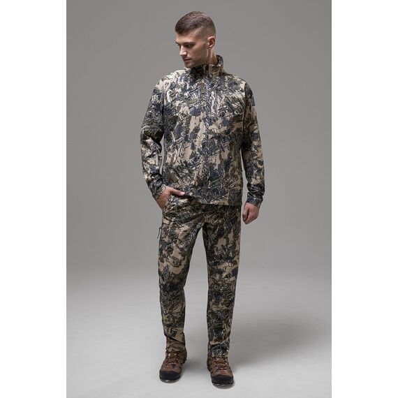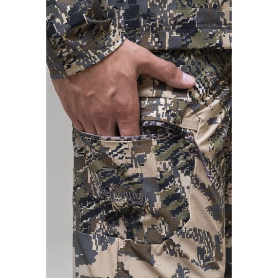 Регулировки объема и зауженный крой брюк обеспечивают удобную посадку. На коленях есть карманы для защитных вставок, а дополнительные карманы для личных вещей удобно расположены. Встроенный капюшон с маскировочной маской позволяет быстро замаскироваться и защититься от ветра и осадков.