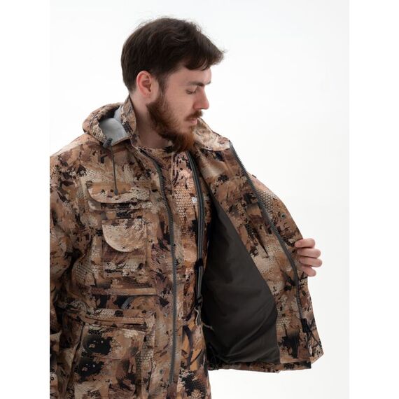 Куртка оснащена двухзамковой молнией с внешней и внутренней ветрозащитными планками, что позволяет расстегивать её сверху или снизу, облегчая доступ к пододетой экипировке. Капюшон регулируется кулисой, как и низ изделия, а объём рукавов настраивается кнопками. Брюки дополнены семью вместительными карманами, усилены на коленях и в области седалища, что увеличивает износостойкость при контакте с влажными поверхностями. Всего костюм насчитывает 22 кармана, включая 15 на куртке, что делает его крайне удобным при продолжительных выходах на природу.