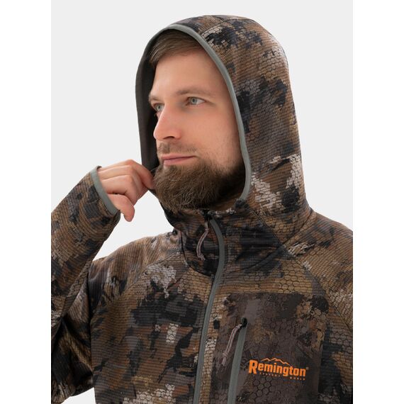 Костюм Remington Oreo Timber создан для охоты и пребывания на природе. Он изготовлен из бесшумной ткани, что помогает оставаться незаметным при передвижении. Капюшон на куртке защищает от ветра и осадков, а внутренняя ветрозащитная планка препятствует проникновению холодного воздуха. Резинка на манжетах фиксирует рукава, а отверстие под палец помогает сохранить положение рукава при движении. Кулиса по низу куртки позволяет подогнать изделие по фигуре.