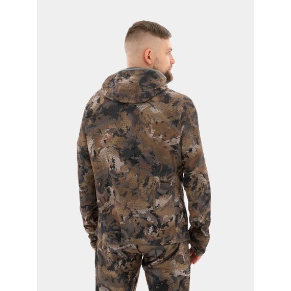 Флисовая подкладка на спине и в капюшоне сохраняет тепло. Карманы в боковых швах на куртке и брюках позволяют разместить необходимые вещи. Эластичный пояс и утягивающий шнурок обеспечивают хорошую посадку. Манжета по низу брюк защищает от пыли и ветра. Модель разработана совместно с охотниками для максимальной функциональности в полевых условиях.