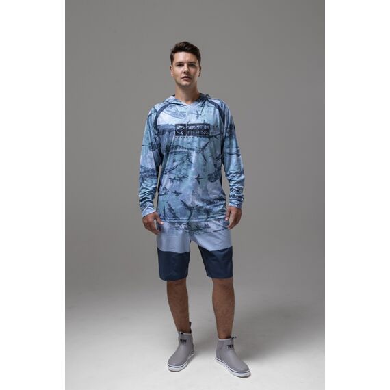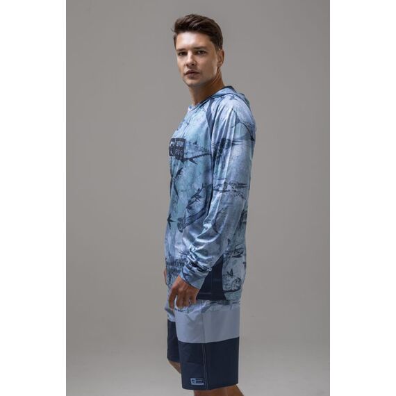 Футболка (джерси) Remington Fishing Breeze Blue изготовлена из тонкого полиэстера — быстросохнущего материала, который эффективно отводит влагу от тела. Благодаря этому модель можно использовать в качестве первого слоя при работе с мембранной одеждой. Ткань имеет защиту от солнца UPF 50+, надежно предохраняя кожу от агрессивных ультрафиолетовых лучей. Втачной капюшон позволяет при необходимости защитить голову от солнца. Яркий принт и логотип на груди подчеркивают приверженность к бренду.