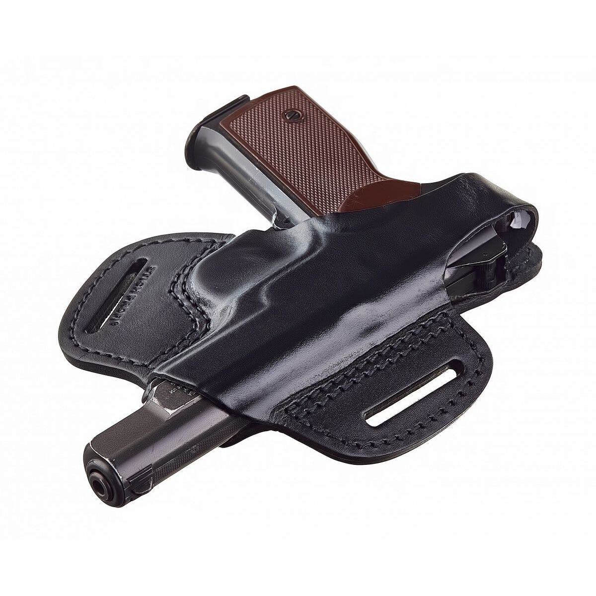 Два уха, через которые проходит ремень максимально прижимают кобуру с пистолетом к поясу, что делает пистолет практически незаметным даже с легкой одеждой. Ширина прорезей в «ушах» на кобуре по умолчанию рассчитана на максимально широкий ремень, то есть офицерский или «портупейный», шириной 50 мм. Но по желанию покупателя может быть изменена под более узкий ремень.