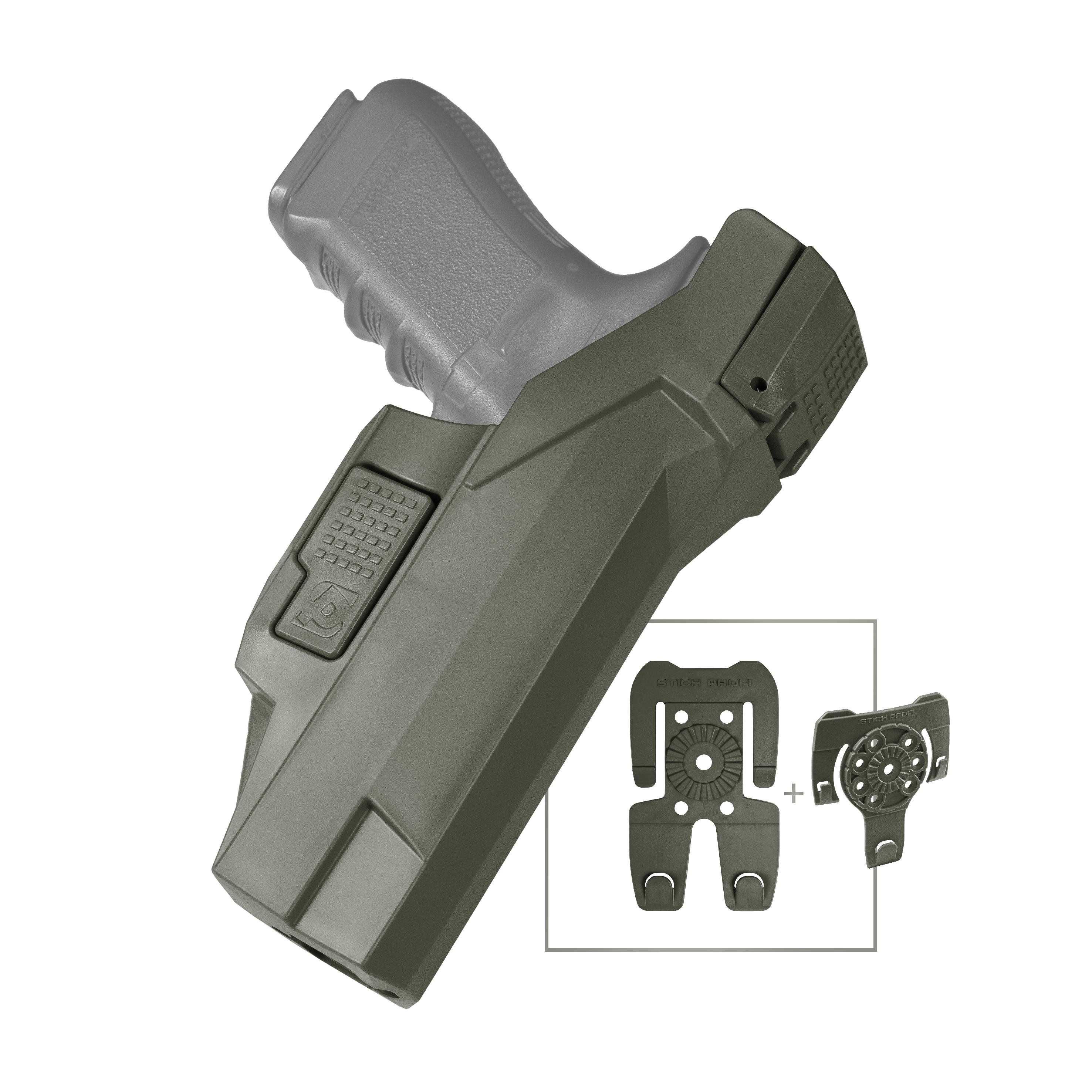 Выполнена из высокопрочного пластика. ,Новая модель имеет две точки фиксации: за спусковую скобу и заднюю часть затворной рамы пистолета.Наличие второй точки фиксации позволяет более надежно удерживать пистолет в кобуре, что защищает владельца от несанкционированного извлечения оружия. С другой стороны, наличие дополнительной точки фиксации не мешает быстро извлекать пистолет. Для этого достаточно одним щипковым движением большого и указательного пальца одновременно нажать на рычаг и кнопку удержания.Кобура изготавливается методом литья, что позволяет регулировать прочностные характеристики пластика, в отличии от формовки. Таким образом изделие способно выдерживать гораздо большие нагрузки.Крепление является поясным и позволяет регулировать угол наклона в произвольном положении.Цвет: Черный