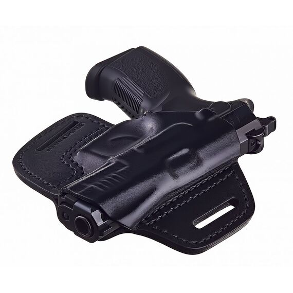 Кобура поясная открытая для Т-12 модель № 19 (на левую сторону под правую руку), производства предприятия Стич Профи г.Екатеринбург, предназначена для ношения и быстрого извлечения пистолета Т-12. Данная кобура изготавливается из высококачественной натуральной кожи и прошита высококачественными нитками со специальной пропиткой, повышенной толщины немецкой фирмы Gutermann. При производстве кобуры использована двухсторонняя формовка, которая выполнена на специальном оборудовании с применением формовочного состава производства Итальянской фирмы KENDA FARBEN для придания кобуре соответствующей формы и жесткости. Данная технология обеспечивает идеальное облегание оружия кобурой, что обеспечивает удержание оружия в кобуре даже без дополнительного хлястика. Формовка выполняется по конкретному виду оружия, что гарантирует высокое качество изделия. Кобура изготавливается в двух основных цветах, черном и коричневом (цвета коньяка) и предназначена для ношения на левой стороне (в районе 10-11 часов) под правую руку. Расположение пистолета относительно ремня с малым (максимум 5 градусов) наклоном назад. Конструкция кобуры обеспечивает плотное удержание пистолета, поэтому дополнительный хлястик отсутствует, что позволяет использовать оружие за менее продолжительный промежуток времени. Два уха, через которые проходит ремень максимально прижимают кобуру с пистолетом к поясу, что делает пистолет практически незаметным даже с легкой одеждой. Ширина прорезей в «ушах» на кобуре по умолчанию рассчитаны на ремень шириной 40 мм. Но по желанию покупателя может быть изменена под другой ремень. По спецзаказу покупателя возможно изготовление данной кобуры для левши, то есть на правую сторону, под левую руку. Так как в процессе формовки кобуры кожа немного "садится в размерах", первоначальное размещение и извлечение оружия в кобуре может быть затруднительно. Кобура должна пройти период "притирки" к Вашему оружию, которая заключается в не многократном размещении и извлечении пистолета и может продлиться один-два дня. Это неудобство будет компенсировано в дальнейшем плотным размещением оружия в кобуре на протяжении всего срока службы.Расположение: Правша, Цвет: Черный, Ширина ремня: 40 мм.