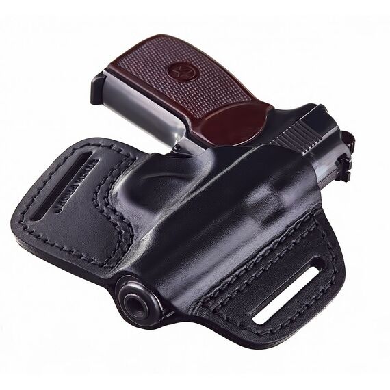 Кобура поясная открытая для ПМ, модель № 19 (на левую сторону под правую руку), производства предприятия Стич Профи г.Екатеринбург, предназначена для ношения и быстрого извлечения пистолета ПМ. Данная кобура изготавливается из высококачественной натуральной кожи и прошита высококачественными нитками со специальной пропиткой, повышенной толщины немецкой фирмы Gutermann. При производстве кобуры использована двухсторонняя формовка, которая выполнена на специальном оборудовании с применением формовочного состава производства Итальянской фирмы KENDA FARBEN для придания кобуре соответствующей формы и жесткости. Данная технология обеспечивает идеальное облегание оружия кобурой, что обеспечивает удержание оружия в кобуре даже без дополнительного хлястика. Формовка выполняется по конкретному виду оружия, что гарантирует высокое качество изделия. Кобура изготавливается в двух основных цветах, черном и коричневом (цвета коньяка) и предназначена для ношения на левой стороне (в районе 10-11 часов) под правую руку. Расположение пистолета относительно ремня с малым (максимум 5 градусов) наклоном назад. Конструкция кобуры обеспечивает плотное удержание пистолета, поэтому дополнительный хлястик отсутствует, что позволяет использовать оружие за менее продолжительный промежуток времени. Два уха, через которые проходит ремень максимально прижимают кобуру с пистолетом к поясу, что делает пистолет практически незаметным даже с легкой одеждой. Ширина прорезей в «ушах» на кобуре по умолчанию рассчитаны на максимально широкий ремень, то есть офицерский или «портупейный», шириной 50 мм. Но по желанию покупателя может быть изменена под более узкий ремень. По спецзаказу покупателя возможно изготовление данной кобуры для левши, то есть на правую сторону, под левую руку. Так как в процессе формовки кобуры кожа немного "садится в размерах", первоначальное размещение и извлечение оружия в кобуре может быть затруднительно. Кобура должна пройти период "притирки" к Вашему оружию, которая заключается в не многократном размещении и извлечении пистолета и может продлиться один-два дня. Это неудобство будет компенсировано в дальнейшем плотным размещением оружия в кобуре на протяжении всего срока службы.Расположение: Левша, Цвет: Черный, Ширина ремня: 50 мм.
