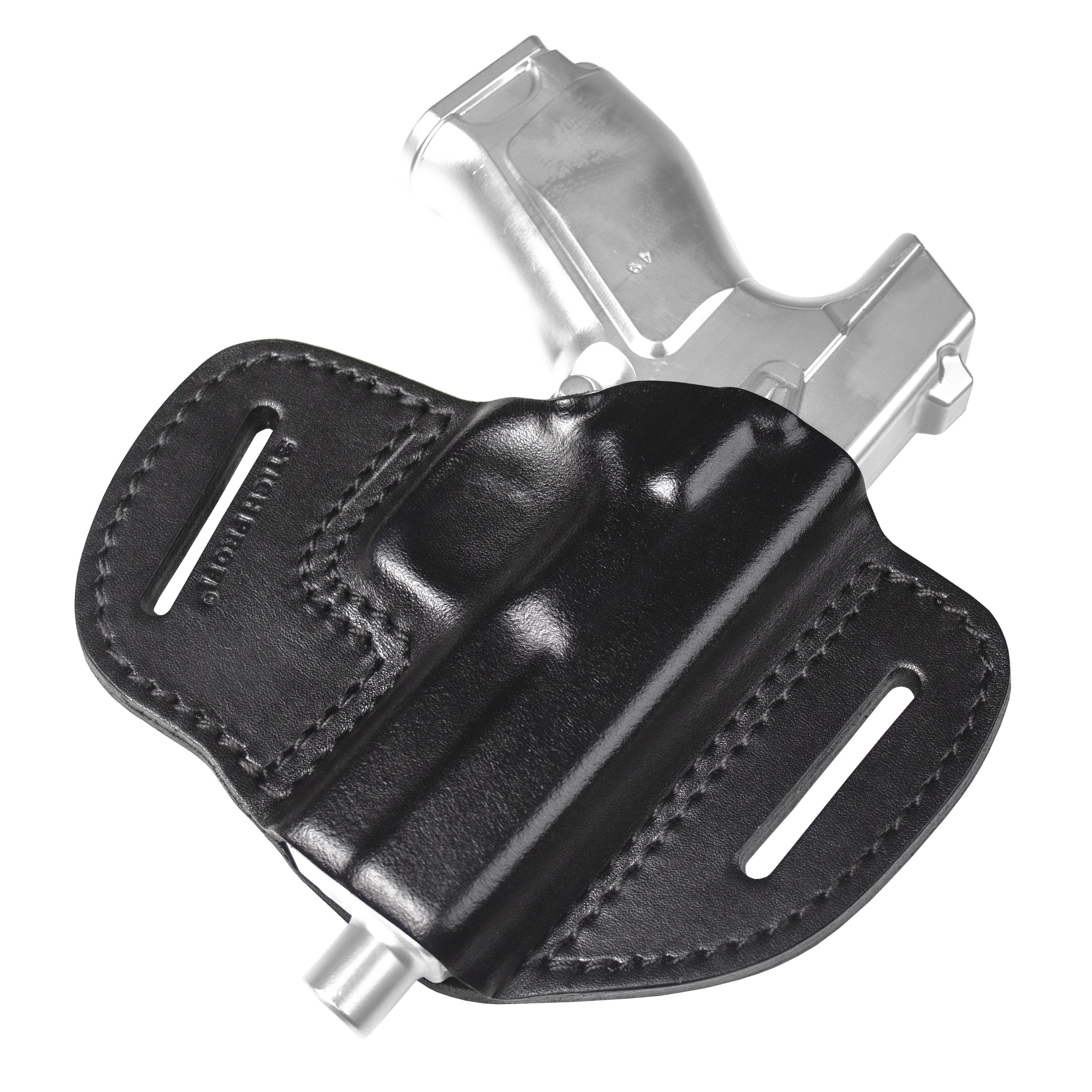 Два уха, сквозь которые проходит ремень плотно прижимают кобуру с пистолетом к поясу, что делает оружие практически незаметным, даже под легкой одеждой.