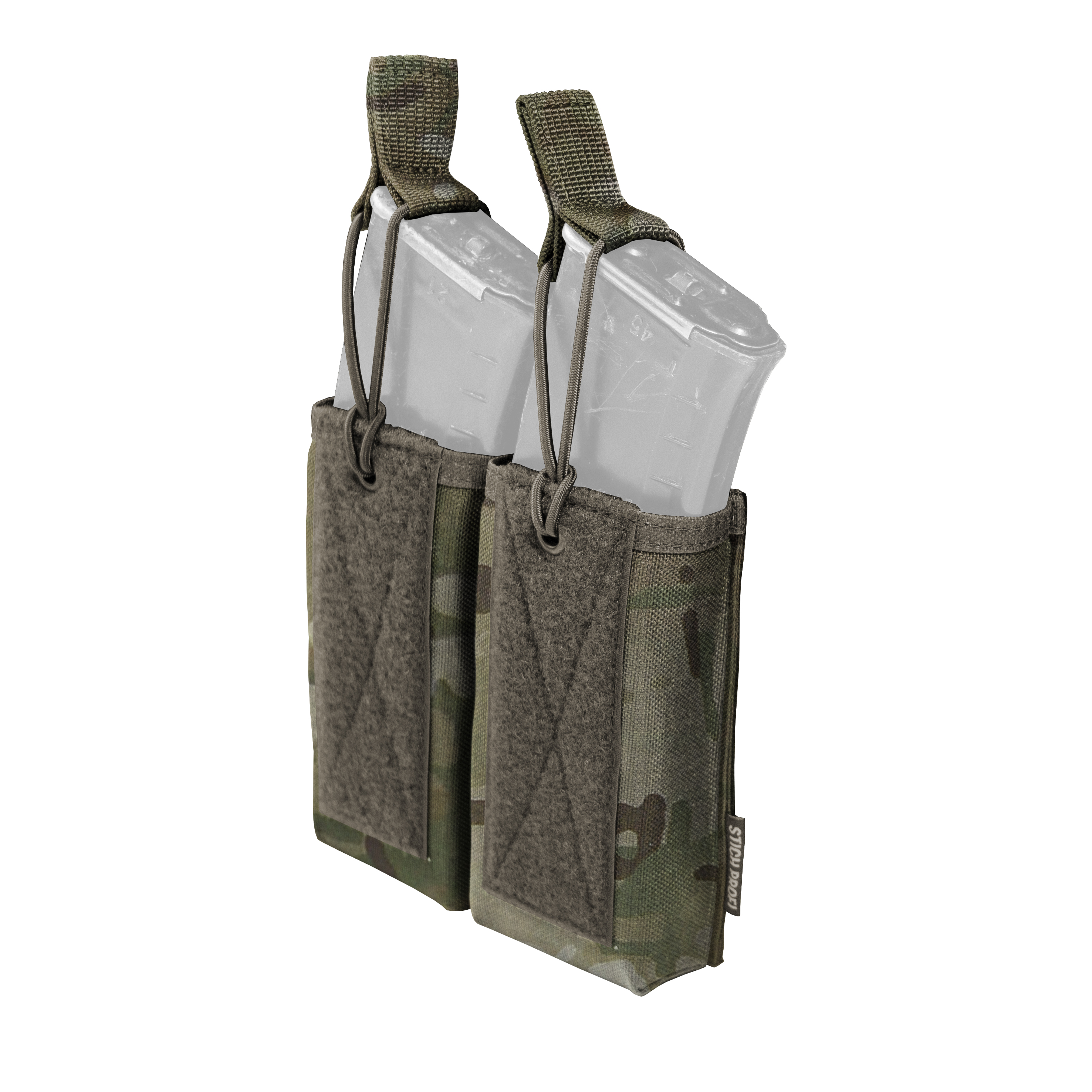 Сдвоенный модульный подсумок "вставка" на 2 магазина АК с пластиковой вставкой.Открытая конструкция удерживает магазин за счёт жёсткости конструкции и трения, с дополнительной страховкой при помощи петель из эластичной стропы с флажками-ухватками из текстильной стропы. Конструкция и габаритные размеры оптимизированы под размещение магазинов к автомату Калашникова калибра 5,45х39 и 7,62х39 мм.